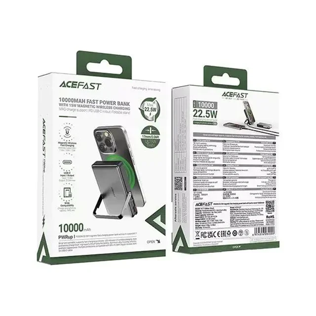 پاوربانک ACEFAST M17 با ظرفیت 10000 میلیآمپر ساعت و ظرفیت اسمی 6000 میلیآمپر ساعت، انرژی کافی برای شارژ چندباره گوشی، تبلت و هدفون را فراهم میکند. فناوری شارژ مغناطیسی بیسیم این دستگاه امکان اتصال بدون کابل و شارژ با توان 5 تا 15 وات را بهصورت سریع و آسان میدهد.