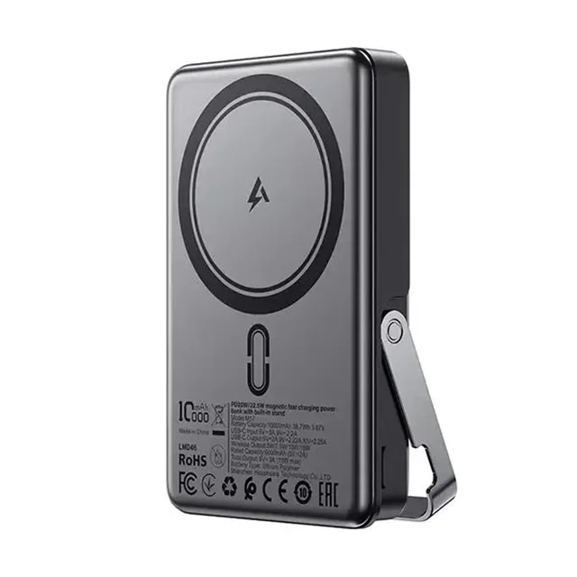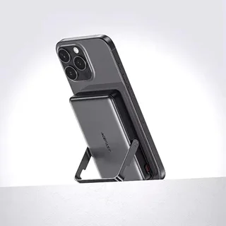 نمایشگر LED میزان شارژ باقیمانده و وضعیت شارژ بیسیم را نشان میدهد. استند تاشو این پاوربانک امکان قرار دادن گوشی در زاویه مناسب برای تماشای ویدئو یا تماس تصویری را فراهم میکند.