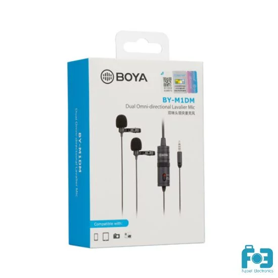 میکروفون یقه ای بویا BY-M1DM یک میکروفون کاندنسر با الگوی قطبی همهجهته (Omnidirectional) است که برای ضبط صدای دو نفر بهصورت همزمان طراحی شده است. این میکروفون دارای دو کپسول میکروفون است که به یک خروجی ۳.۵ میلیمتری TRRS متصل میشوند و امکان ضبط صدا از دو منبع را فراهم میکند.