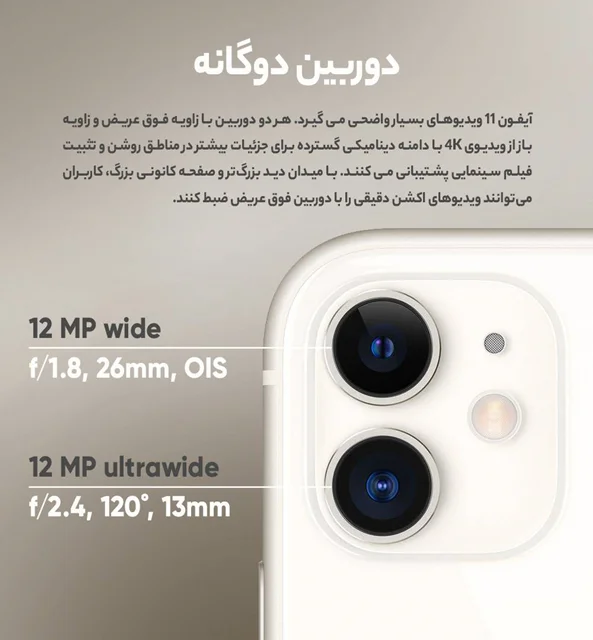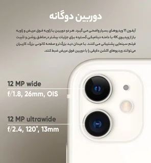 آیفون ۱۱، یکی از محبوبترین گوشیهای اپل، در سال ۲۰۱۹ عرضه شد و با ترکیبی از طراحی جذاب، عملکرد عالی و قیمتی مقرونبهصرفه در مقایسه با مدلهای پرو، توانست جایگاه ویژهای در بازار پیدا کند. بدنهی این گوشی از جنس آلومینیوم و شیشهی مقاوم ساخته شده و در برابر آب و گردوغبار با استاندارد IP68 مقاوم است. صفحهنمایش ۶٫۱ اینچی Liquid Retina از نوع LCD، با وضوح ۱۷۹۲ در ۸۲۸ پیکسل و تراکم ۳۲۶ پیکسل در هر اینچ، کیفیت رنگ و روشنایی بسیار خوبی ارائه میدهد، گوشی اپل به پردازندهی A13 Bionic مجهز است که با معماری ۷ نانومتری ساخته شده و شامل CPU شش هستهای، GPU چهار هستهای و موتور عصبی هشت هستهای است. چنین ترکیبی عملکرد قابل قبولی برای اجرای بازیهای گرافیکی و اپلیکیشنهای سنگین ارائه میدهد. آیفون ۱۱ در سه نسخه با فضای ذخیرهسازی ۶۴، ۱۲۸ و ۲۵۶ گیگابایت عرضه میشود که هر سه مدل با ۴ گیگابایت رم همراه هستند در بخش دوربین، آیفون ۱۱ از سیستم دوربین دوگانه شامل دوربین اصلی ۱۲ مگاپیکسلی با گشودگی دیافراگم f/1.8 و دوربین اولتراواید ۱۲ مگاپیکسلی با زاویهی دید ۱۲۰ درجه و دیافراگم f/2.4 استفاده میکند.