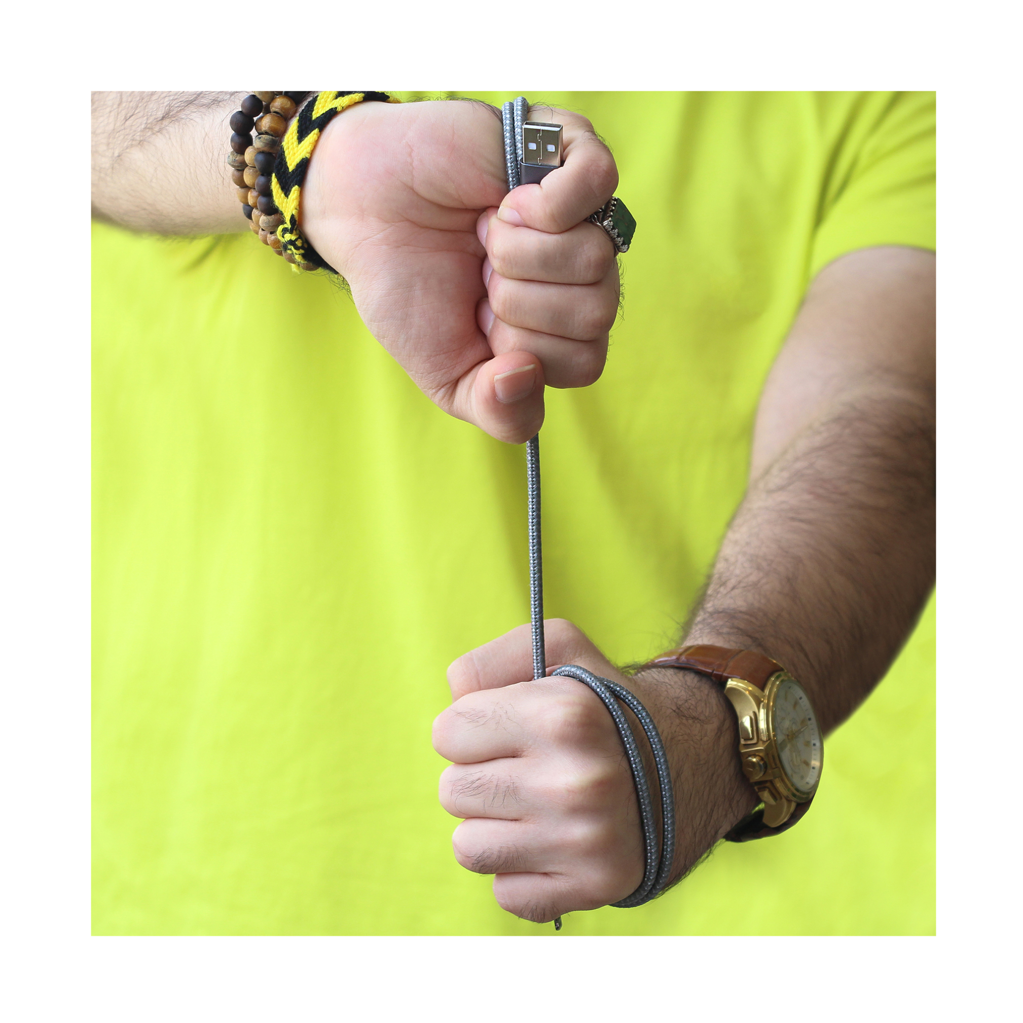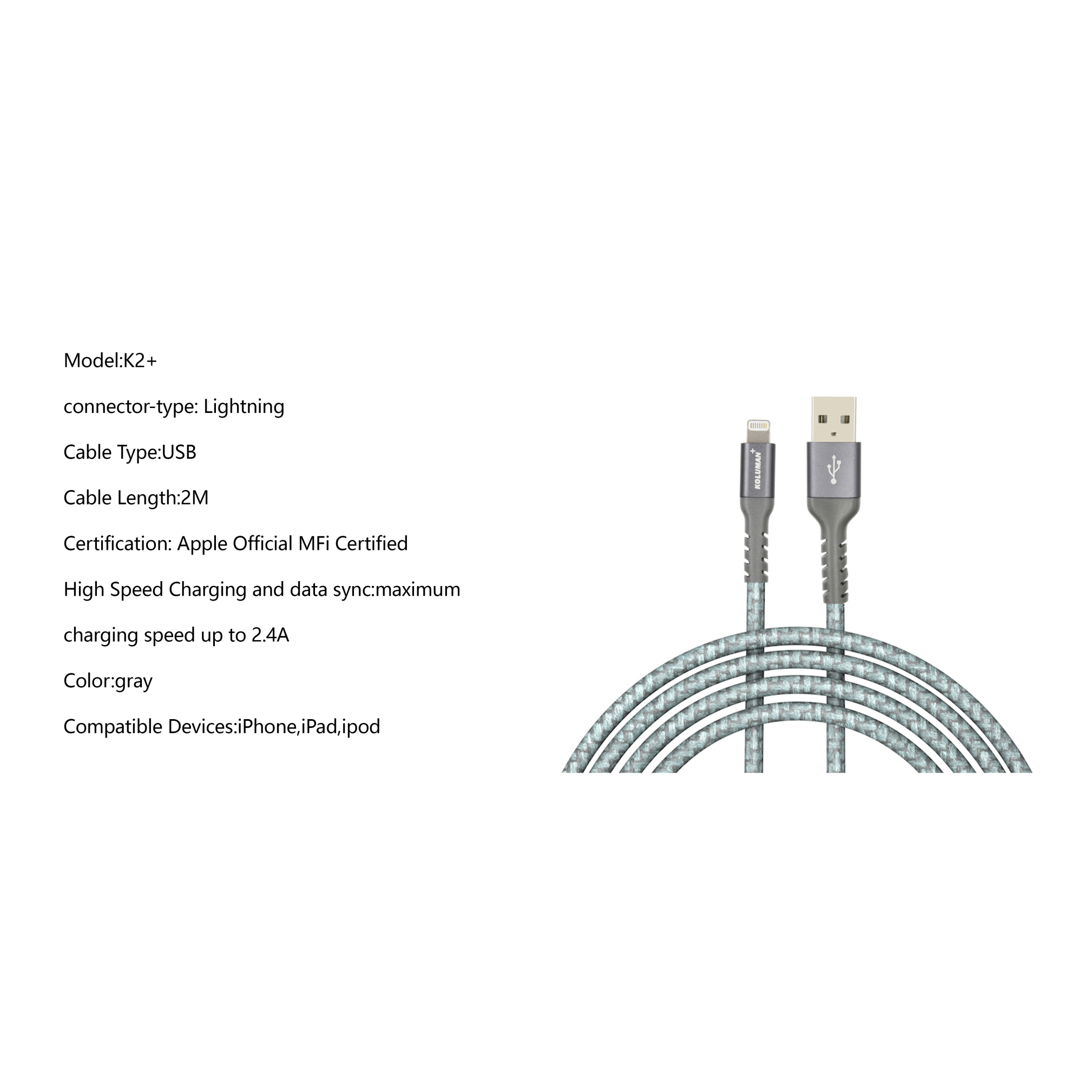 دارای تاییدیه از کمپانی اپل ساخته شده با استاندارد های MFi ساخته شده از ماده ضد گلوله اطمینان از صحت شارژ و انتقال اطلاعات مقاوم در برابر گره خوردن، درهمپیچیدن و کشیدگی دارای روکش کنفی بافته شده پشتیبانی از شارژ سریع با شدت جریان ۲.۴ آمپر طول کابل: یک متر دارای کانکتورهای مقاوم